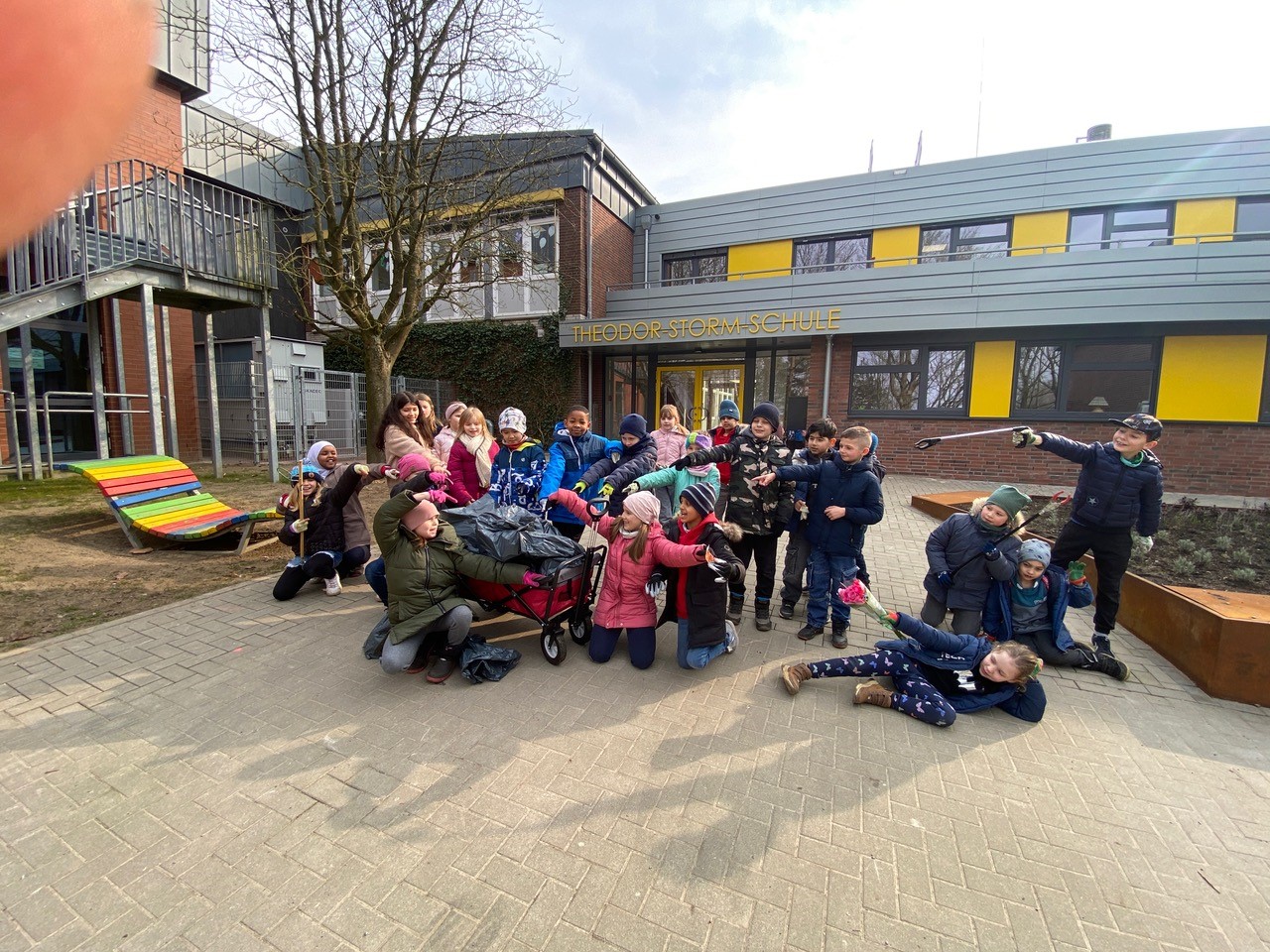Die Klasse 2b hat am 11.3.2025 im Rahmen der Aktion „Unser sauberes Schleswig - Holstein“ bei strahlendem Sonnenschein rund um die Schule und in der Gorch-Fock-Straße Müll gesammelt. Neben Plastik-Verpackungen, Flaschen, Kleidung … wurde auch ein frischer Strauß mit Rosen gefunden. Auf dem Rückweg trafen die Kinder ein freundliches Ehepaar, welches in der Gorch-Fock-Straße wohnt. Sie freuten sich so sehr über das Engagement der Kinder, dass sie ihnen eine Spende von 10 Euro übergaben. Gemeinsam wurde mit allen Kindern beschlossen, davon ein Eis zu kaufen. Die Sammelaktion war somit ein voller Erfolg.